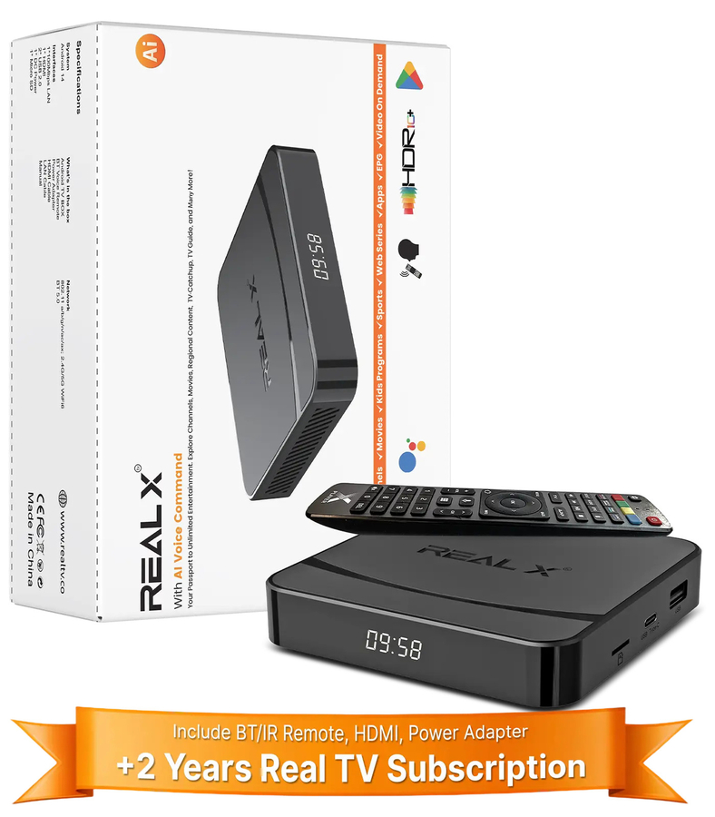 Real TV brings your favorite entertainment to life—with live shows, movies, dramas, and news in Hindi, Tamil, Telugu, Punjabi, Malayalam, all in one place. Our IPTV Set Top Box for Indian Channels makes it easy to stay connected to Indian culture and TV. Stream in stunning 8K Ultra HD, explore an endless library of VOD, and enjoy smart, AI-powered suggestions with built-in Google Assistant. Real X transforms your home into a premium viewing destination.